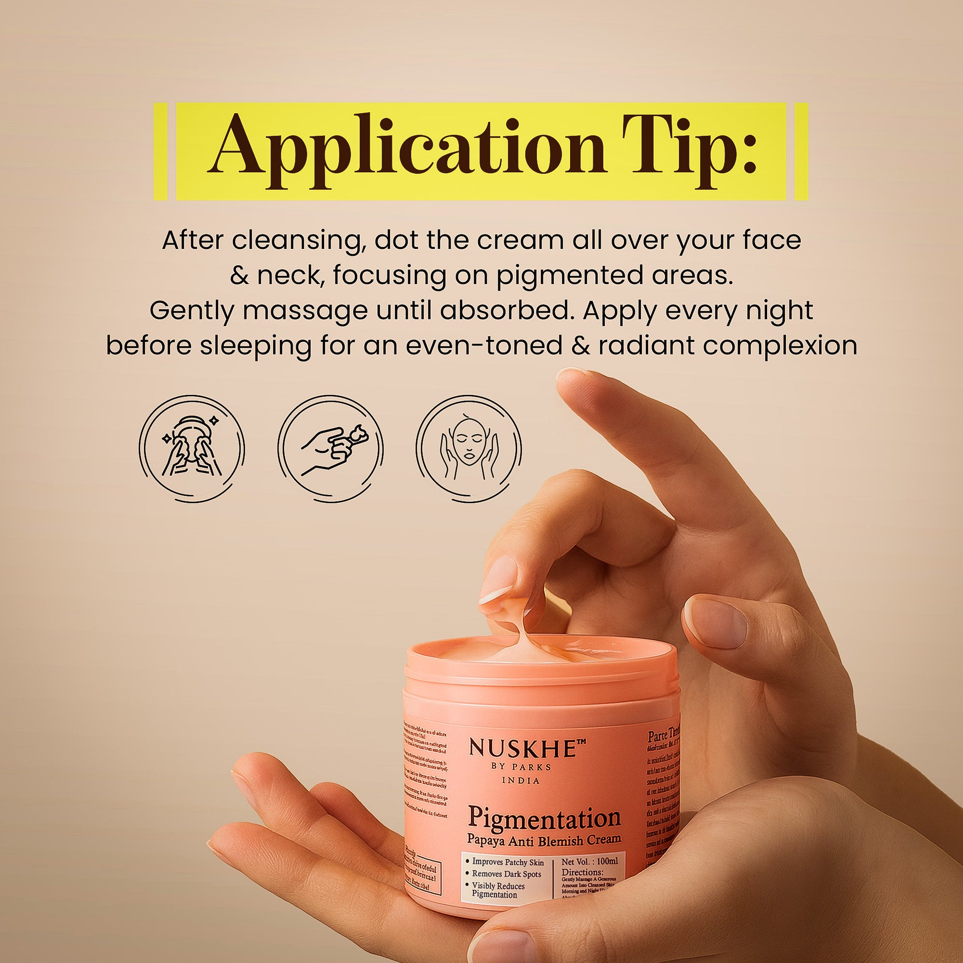 Use generously morning and night for visible results in weeks. Our Ayurvedic Pigmentation Papaya Anti-Blemish Cream is a Premium Formula to get rid of un-natural skin spots That are Caused by the Effect of Acne, Pimples, Pigmentation, Under Aram Spots, Blemishes, Under Eye Dark Circles Etc. This 30 days money savings combo is better to purchase as it saves a lot of your money.