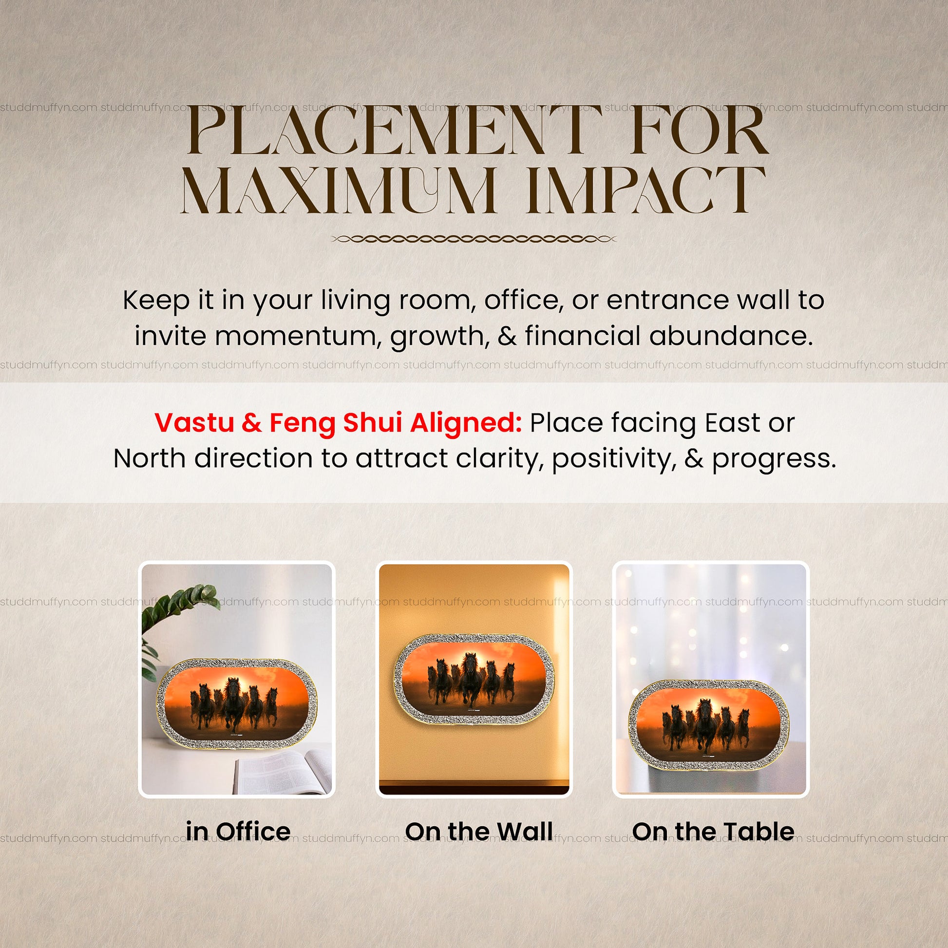 ✨ How to Use: Placement for Prosperity – Keep it in your living room, office, or entrance wall to invite momentum, growth, and financial abundance. Vastu & Feng Shui Aligned – Place facing East or North direction to attract clarity, positivity, and progress. Energize Your Space – The embedded Pyrite crystal radiates protective, wealth-attracting vibrations that uplift your environment. Daily Intention Setting – Stand before the artwork, take a deep breath, and affirm your goals while visualizing the framed artwork charging ahead with your dreams. Sacred Decor – Use as a spiritual décor piece that not only beautifies but also harmonizes energy flow at home or the workplace.