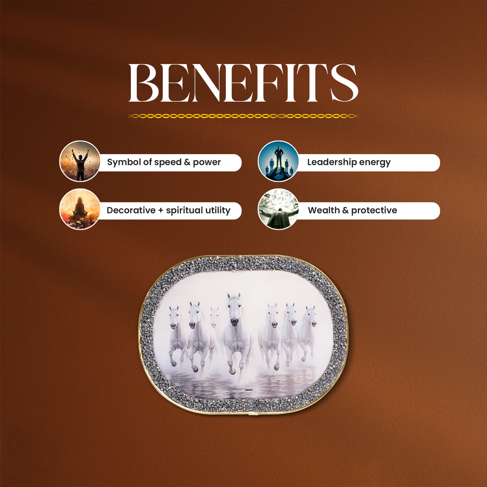 Bring home the divine force of Seven Horses, a universal symbol of speed, power, and success. In Vastu and Feng Shui, the imagery of seven galloping white horses is believed to channel the energy of the Sun God, symbolizing unstoppable momentum, strength, and prosperity.