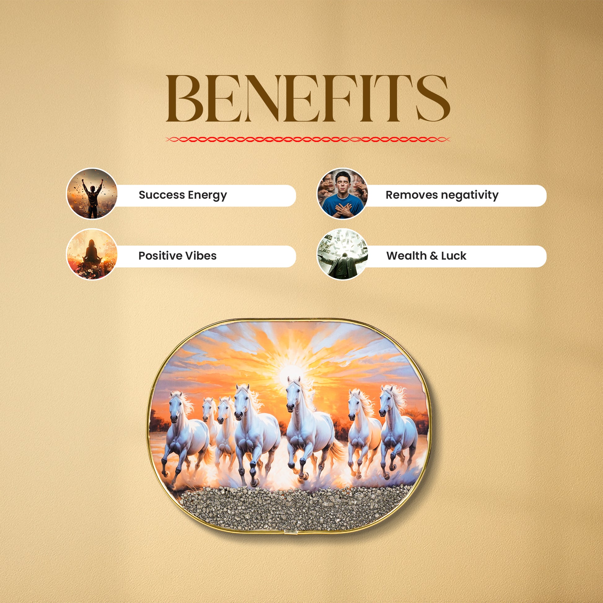 Bring home the power of speed, strength, and abundance with the 7 Running Horses Pyrite Plate. This exquisite décor piece beautifully combines the energy of seven majestic white horses galloping towards success with the prosperity-attracting vibrations of authentic Pyrite crystals. The rising sun in the background symbolizes new beginnings and positivity, while the golden frame adds a touch of elegance, making it a perfect centerpiece for your home or office.