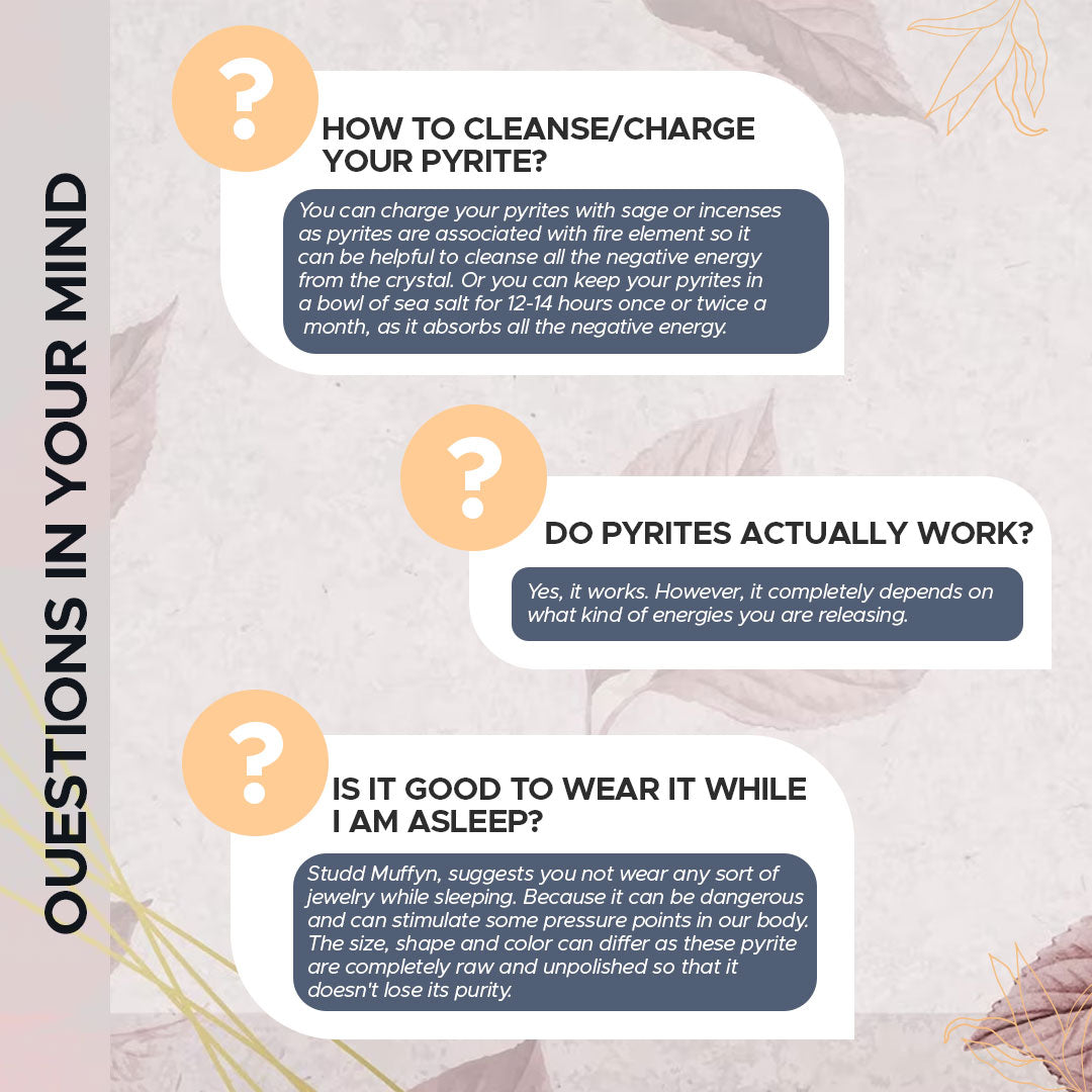 A2: Studd Muffyn, suggests you not to wear any sort of jewelry while sleeping. Because it can be dangerous and can stimulate some pressure points in our body. The size, shape, and color can differ as these pyrites are completely raw and unpolished so that it doesn’t lose their purity.