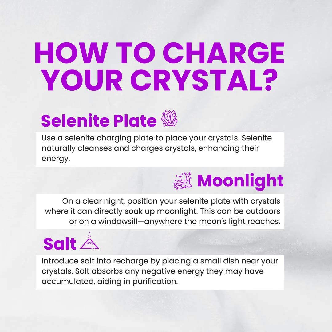 Recharge: The best way to do that is to keep them in a place that gets moonlight, overnight. You can also put the crystal in salt overnight.