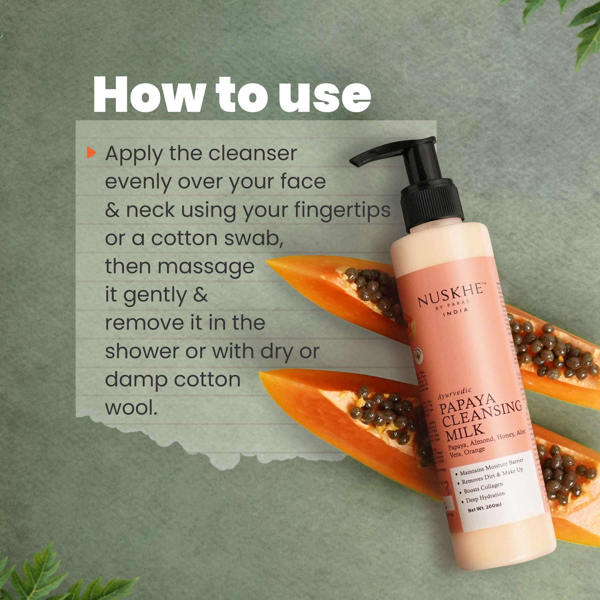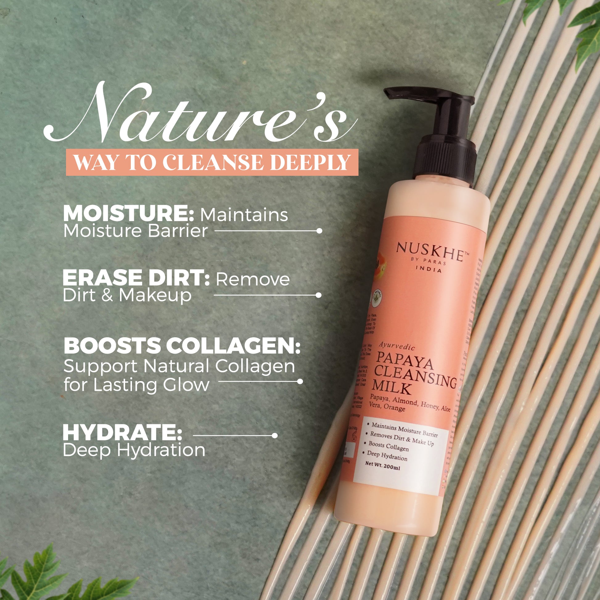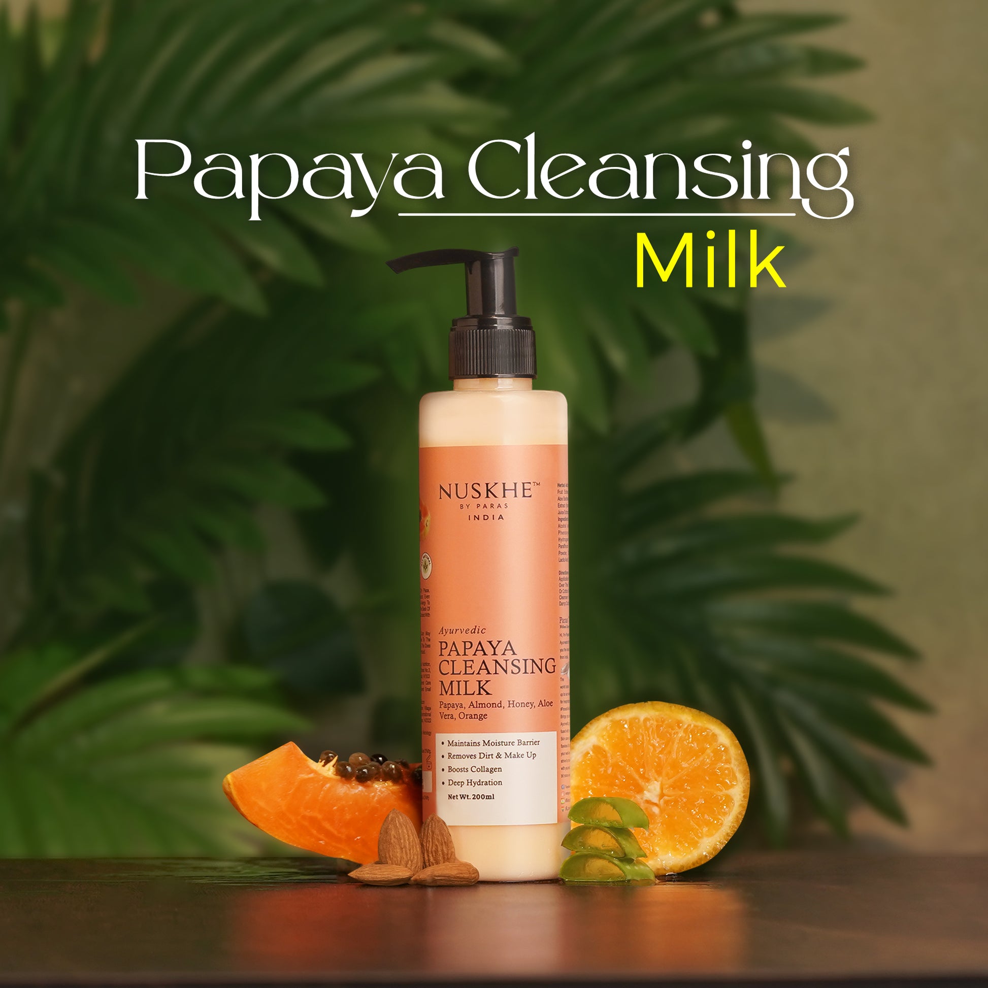 Nuskhe By Paras Ayurvedic Papaya Cleansing Milk is a natural cleansing milk made with a blend of Ayurvedic herbs and papaya extracts, is designed to gently remove dirt, makeup, and impurities from the skin, leaving it clean and refreshed.