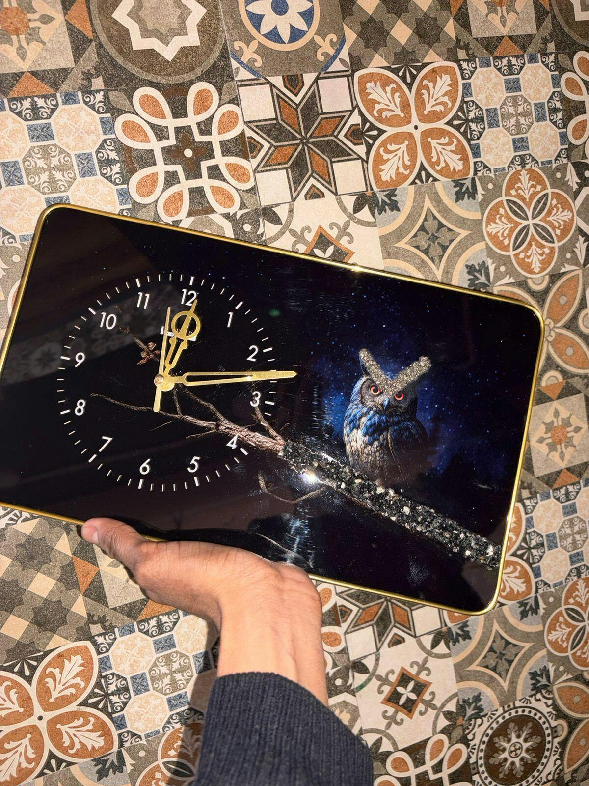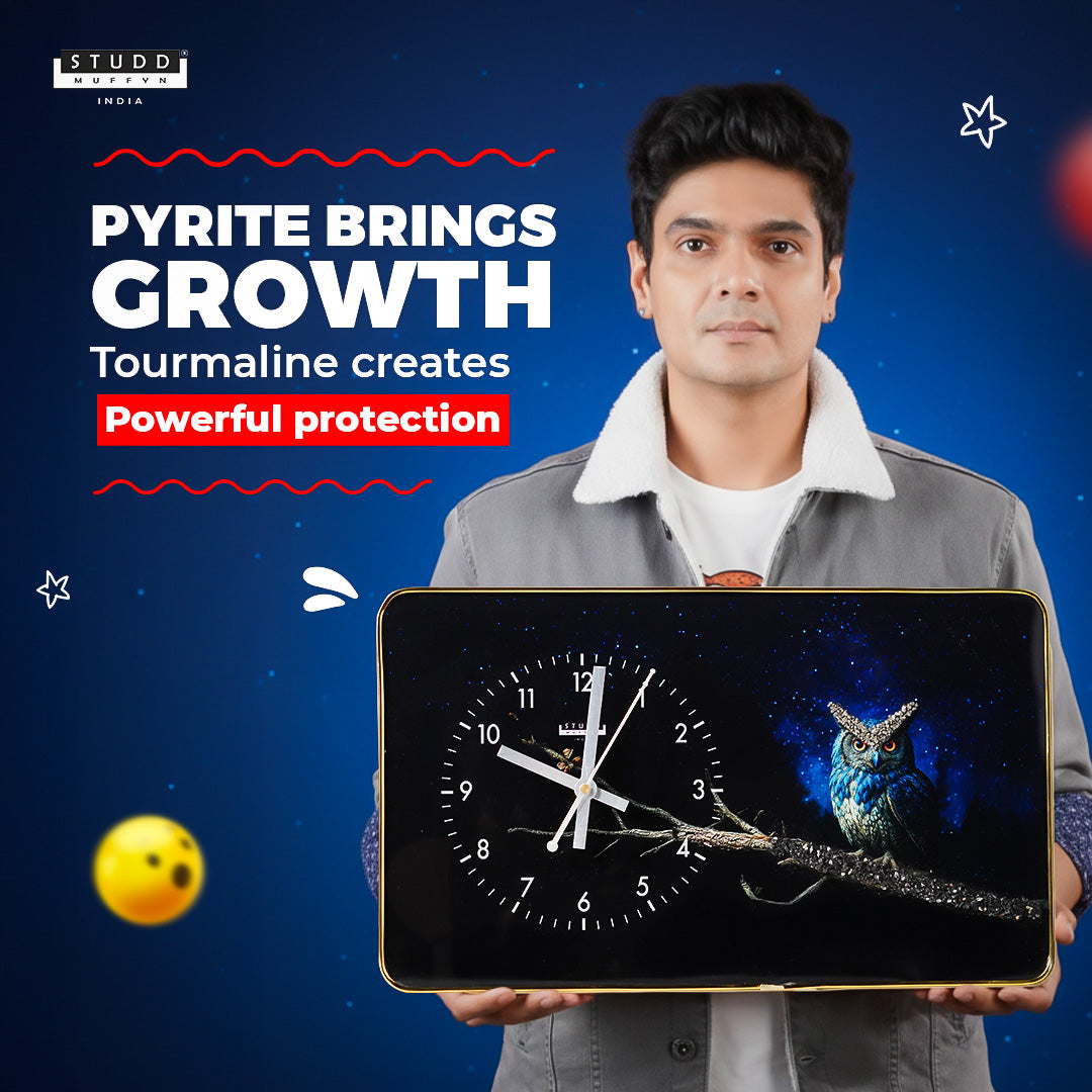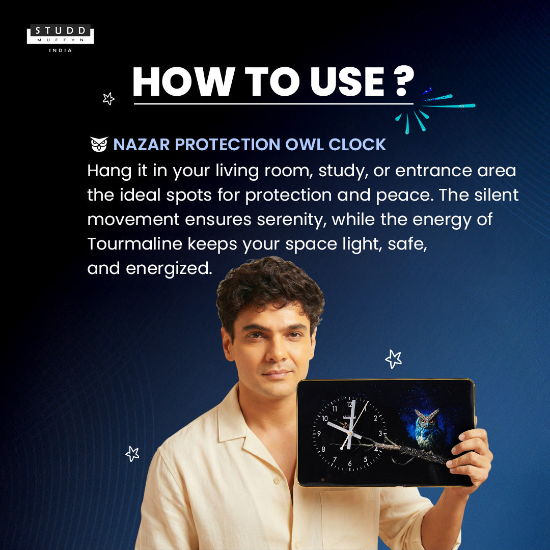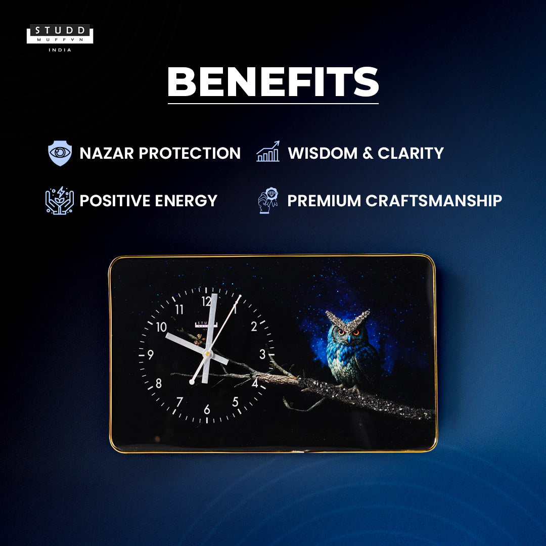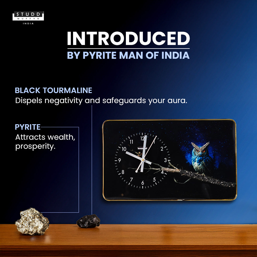 The captivating Owl design, set against a midnight sky, evokes a sense of mystery and insight — perfect for spaces where peace and focus are essential. The protective aura of Black Tourmaline wards off negative energy, making this clock both a beautiful and meaningful addition to your home or workspace.