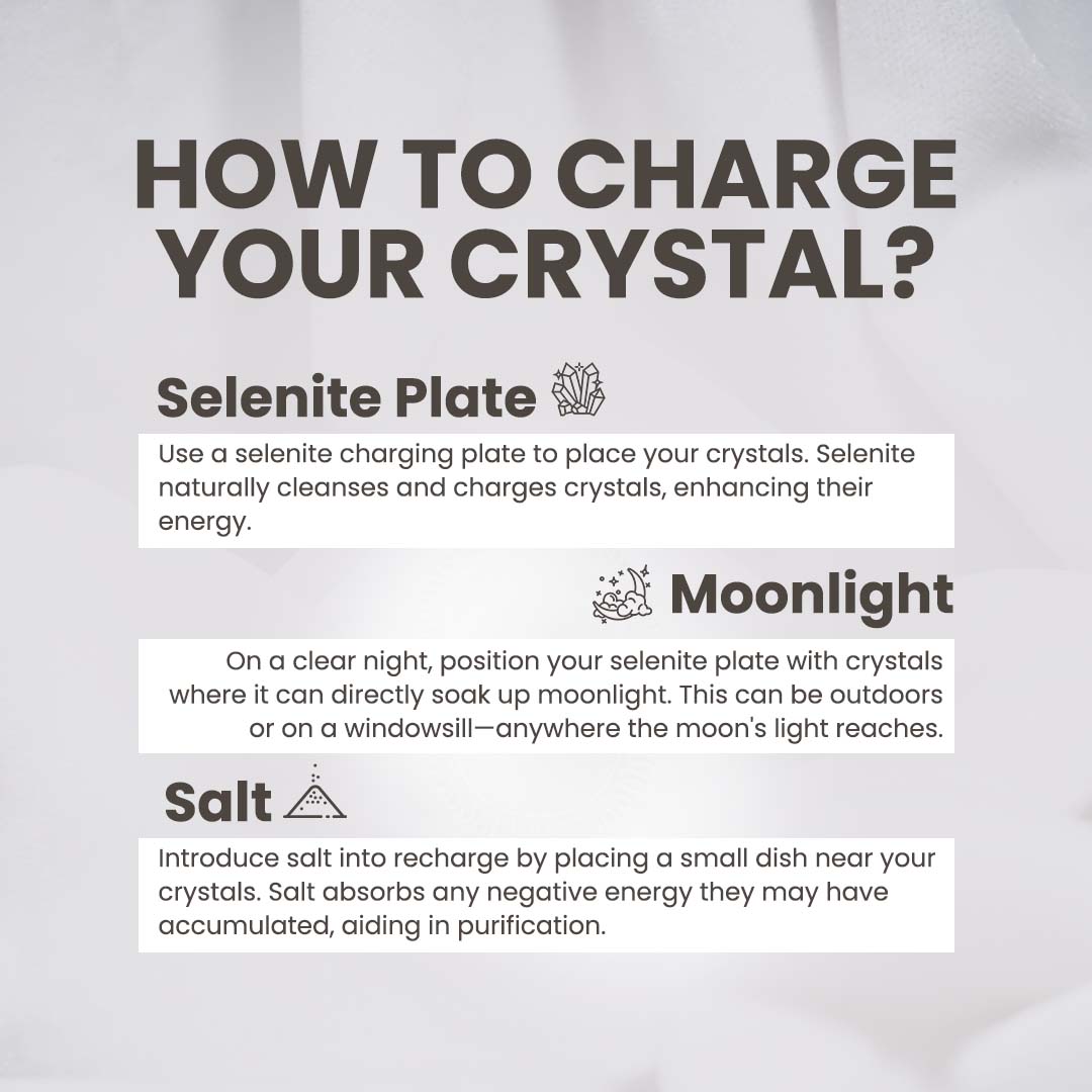Recharge: The best way to do that is to keep them in a place that gets moonlight, overnight. You can also put the crystal in salt for at least 15-20 minutes on normal days. On full moon nights let it sit in salt overnight.