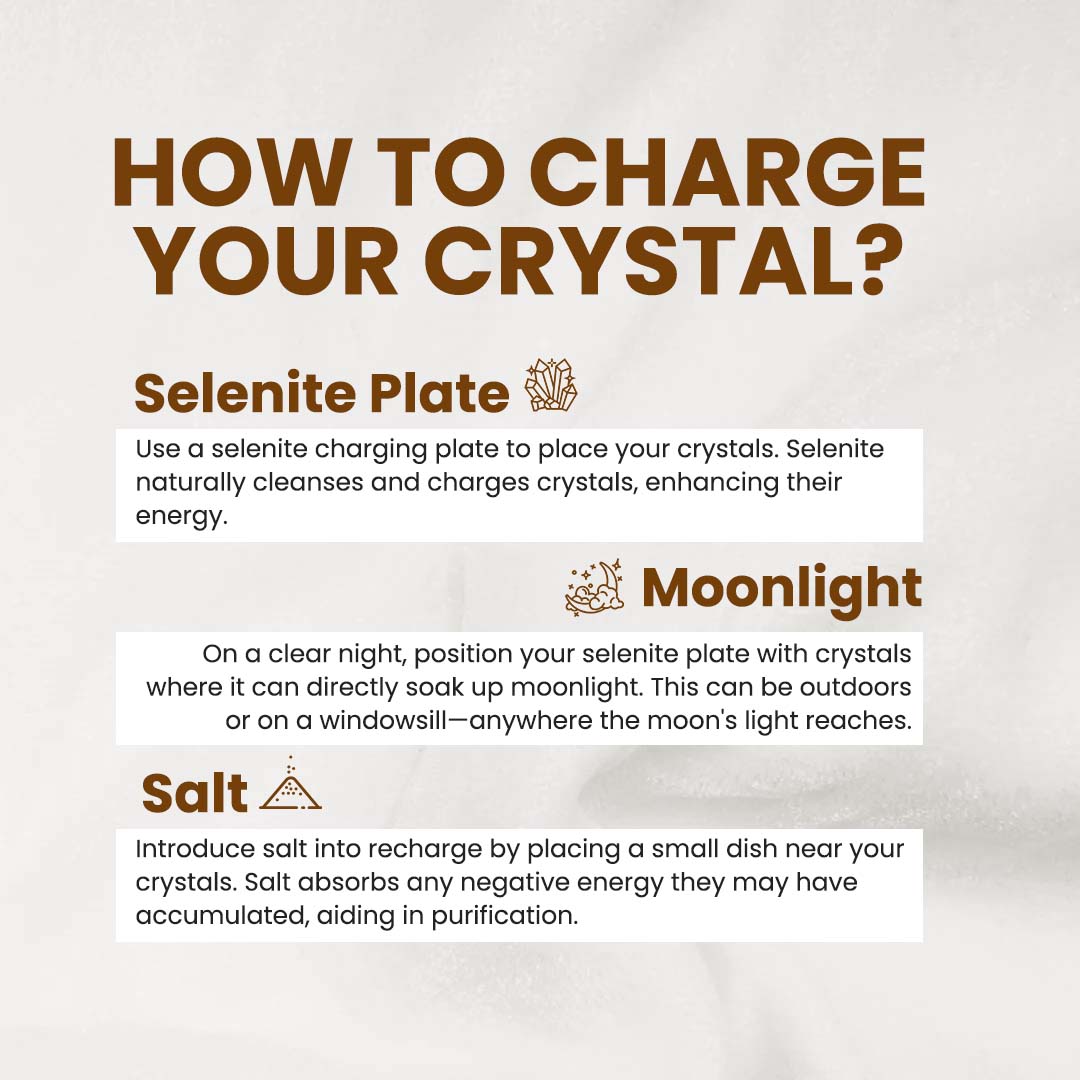 Recharge: The best way to do that is to keep them in a place that gets moonlight, overnight. You can also put the crystal in salt for at least 15-20 minutes on normal days. On full moon nights let it sit in salt overnight.