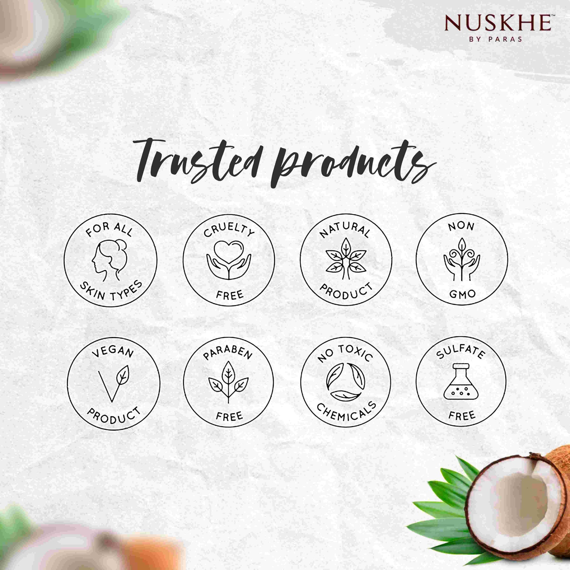 Nuskhe by Paras Coconut Shampoo made with 100% Natural Products and enriched with Coco Nucifera (Coconut Oil), Hydrolyzed Soy Protein, Aloe Barbadensis (Aloe Vera), Leaf Juice, Argan Spinosa Kernel (Argan), Oil Hydrolyzes Keratin, Ecliptaprostrata (Bhringraj) helps in providng nourishment to your hair from root to tip and aids in reducing hair fall in 15-20 days and improves strength, boosts hydration, Restructures Hair Fiber, and revives the silkiness of excessively dry hair.
