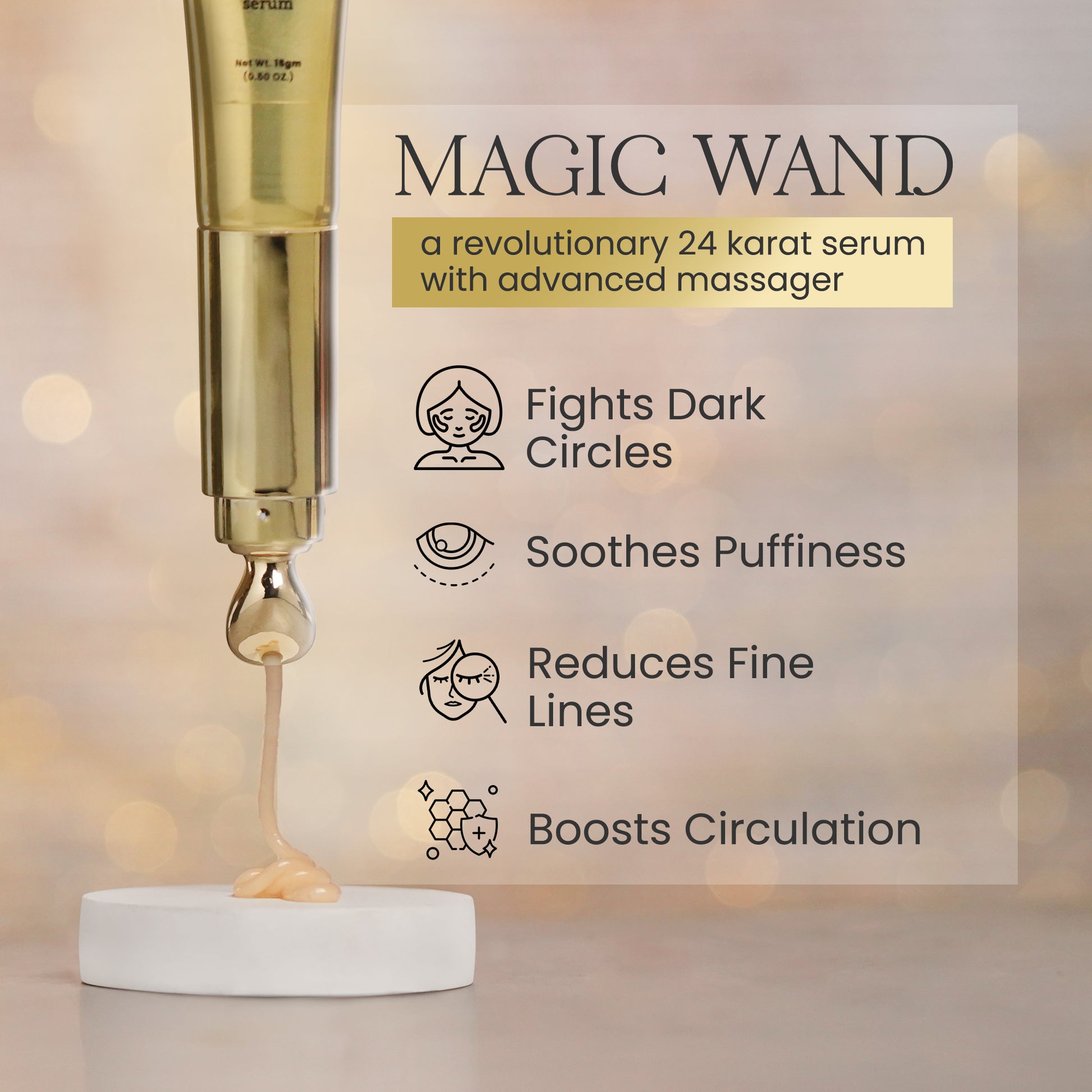 Say goodbye to dark circles, puffy eyes, and fine lines with the Eye Wand, a revolutionary 24-karat serum with an advanced massager designed to give your eyes the care they deserve.