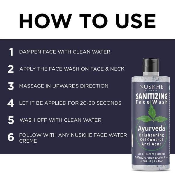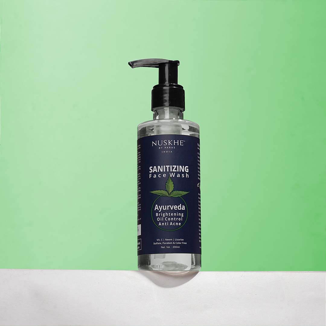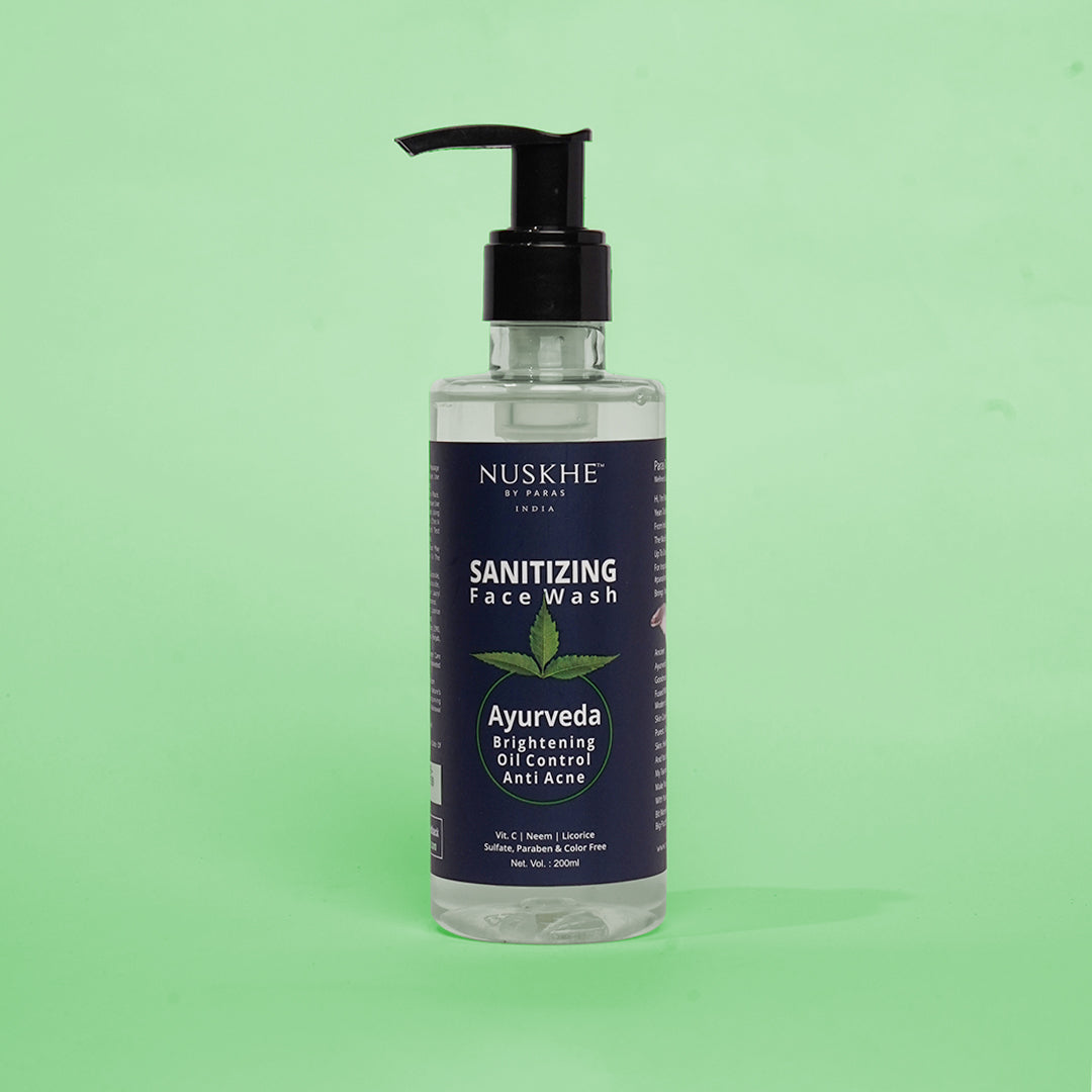 Nuskhe by Paras Sanitizing Face Wash Moisturizes the skin, lightens scars, pigmentation & cures acne and pimples. It is a moisturizing defoliant that slows signs of aging, fights acne & dark spots and antibacterial & anti-inflammatory. Prevents blackheads, acne & relieves skin infections which is enriched with all-natural ingredients like neem, licorice, vitamin C, and aloe vera