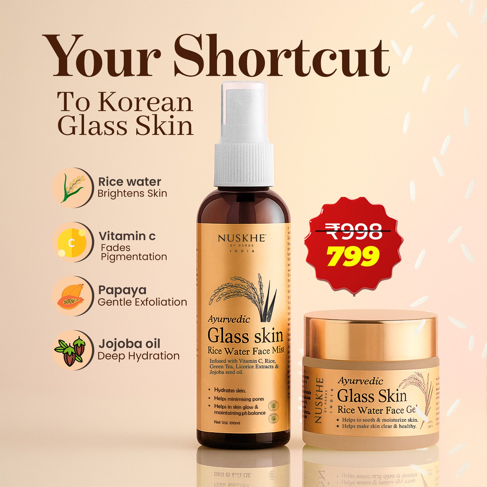 Ayurveda combines with Korean traditional medicine, Introducing you Nuskhe by Paras Glass skin Rice Water Face Mist and Rice Water Face Mist. For flawless radiance, It minimizes pores, curbs acne, reduces dark spots, tightens skin, reduces cellulite, and helps even skin tone. Caution: People with sensitive skin are advised to perform a patch test. If a rash, redness, or itching appears, stop using it. Customer Care at +91-78600 00768, available from 10 AM to 6 PM (Monday to Saturday) |