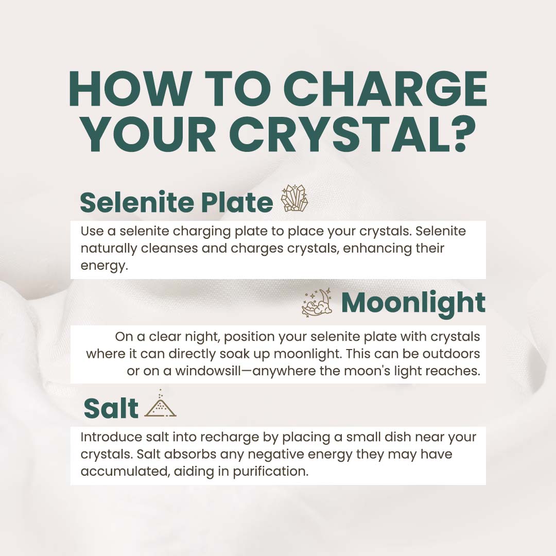 Recharge: The best way to do that is to keep them in a place that gets moonlight, overnight. You can also put the crystal in salt for at least 15-20 minutes on normal days. On full moon nights let it sit in salt overnight.