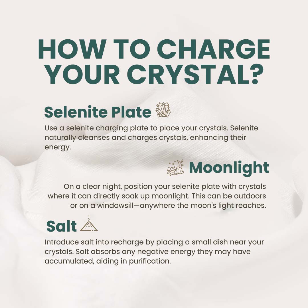 Recharge: The best way to do that is to keep them in a place that gets moonlight, overnight. You can also put the crystal in salt for at least 15-20 minutes on normal days. On full moon nights let it sit in salt overnight.
