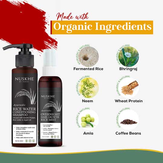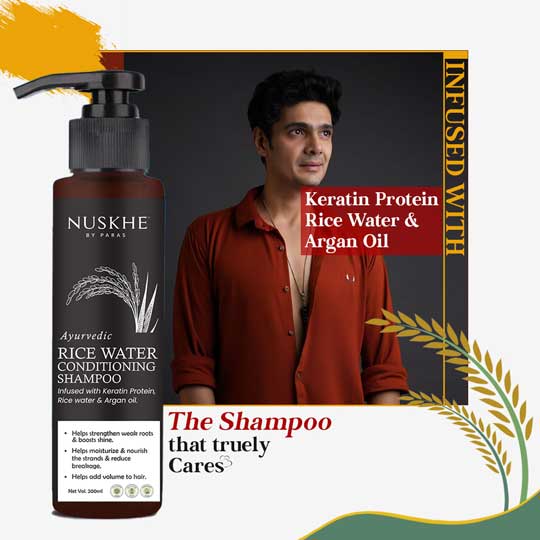Fermented Rice Water helps in reducing hair fall and repairs the damaged cells. It’s basically considered one of the best remedies for all hair types and is useful for a range of hair problems. Nuskhe by Paras Ayurvedic  Fermented Rice Water Conditioning Shampoo combined fermented rice water with Coffee, Bhringraj, Amla & Argan Oil which is beneficial for reducing breakage and adding volume to hair.