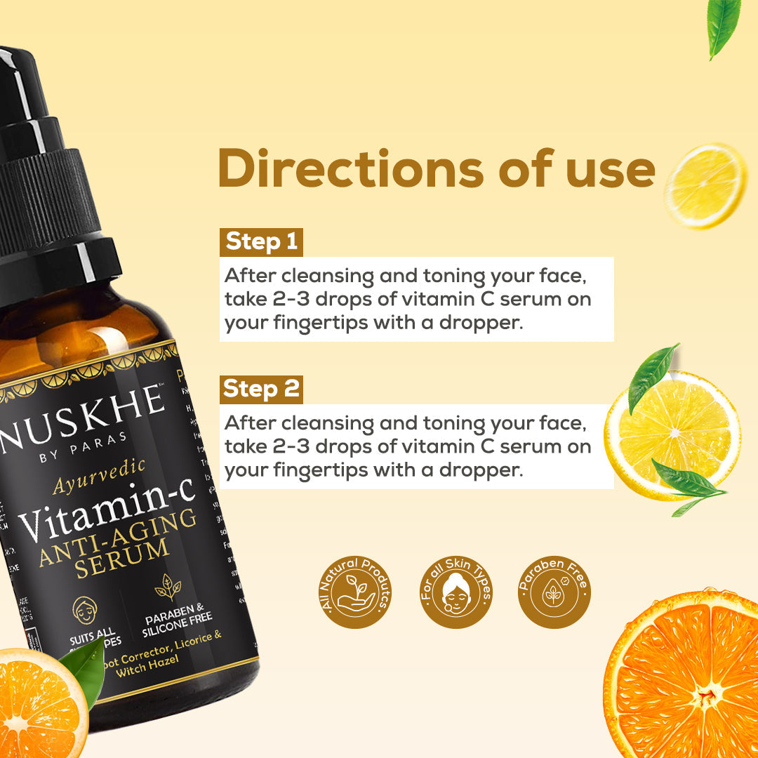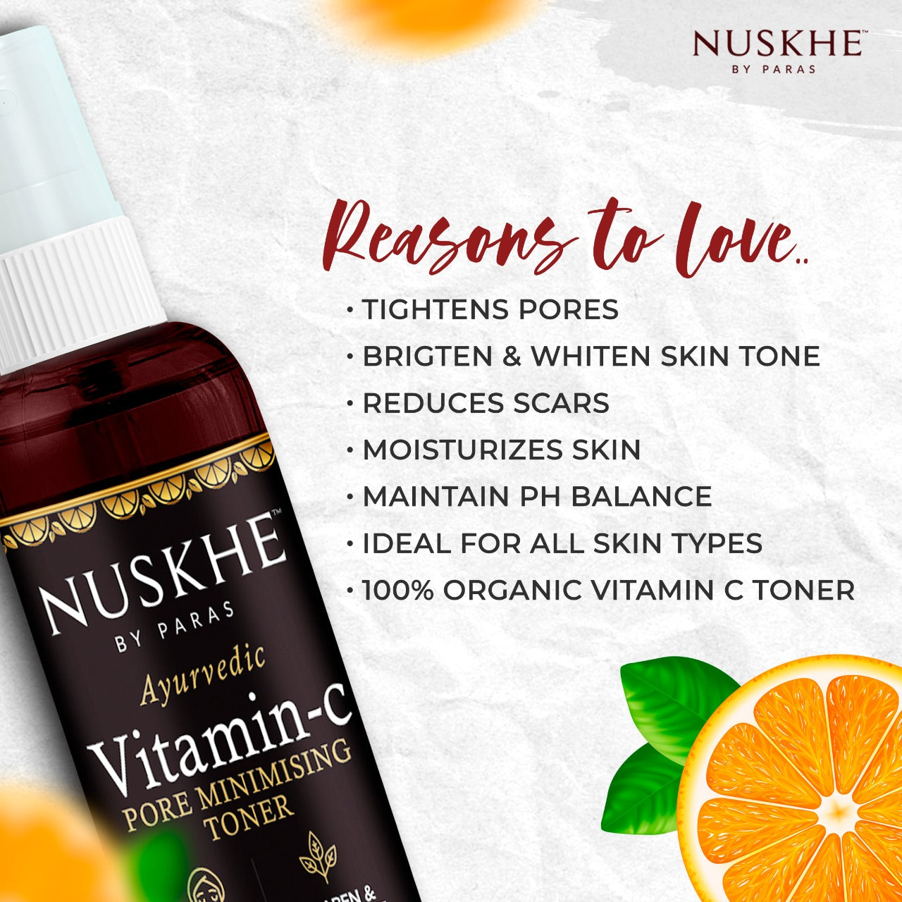 Nuskhe by Paras Ayurvedic Vitamin-C Pore Minimizing Toner: The 'Suraksha Kawach' - a vitamin C-rich powerhouse replenishes your skin's nutrition and restores its pH balance. Hyaluronic Water Gel Locks in moisture, making youthful skin your everyday reality. Vitamin C Skin Serum Covering open pores, wrinkles, blemishes, and pigmentation, gives your face a radiant glow, especially for dark and dull skin.