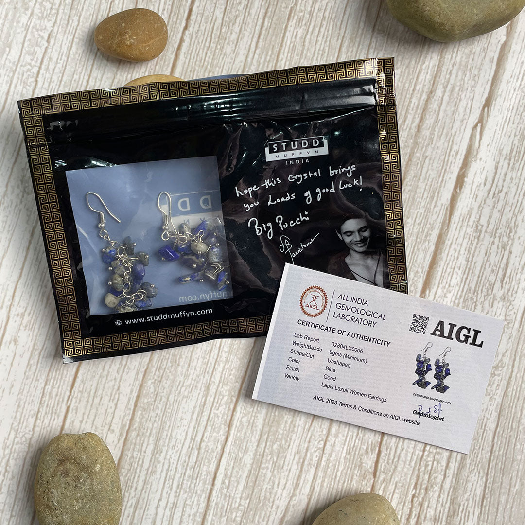 Perfect for adding an enchanting twist to any outfit, these earrings dangle gracefully, catching the light and adding a whimsical flair. Whether you're dressing up for a special occasion or simply want to infuse your everyday style with a bit of magic, these lapis lazuli beauties are sure to make you feel like you're wearing a piece of the cosmos.