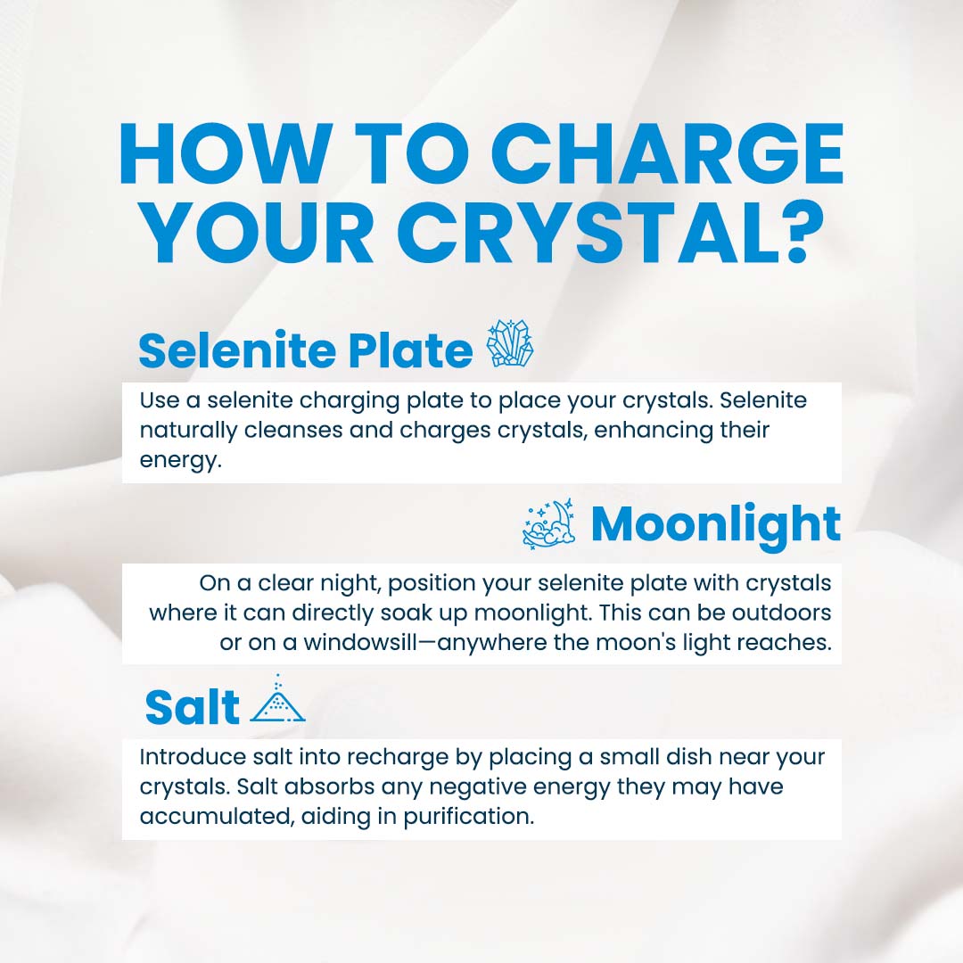 Recharge: The best way to do that is to keep them in a place that gets moonlight, overnight. You can also put the crystal in salt for at least 15-20 minutes on normal days. On full moon nights let it sit in salt overnight.