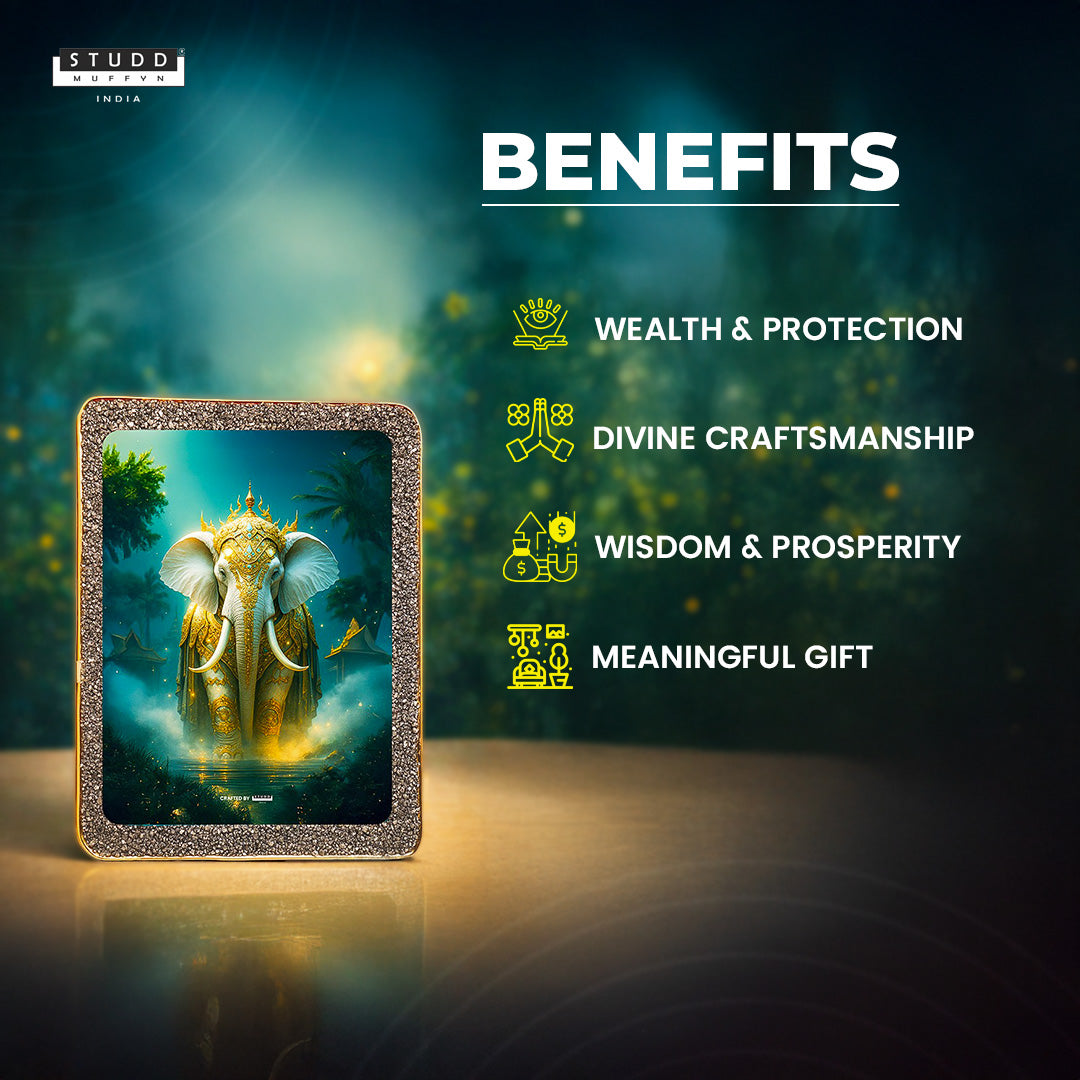 This extraordinary piece captures that sacred symbolism in stunning detail โ a royal elephant, adorned with intricate golden armor, rising with grace and dignity from a mystical backdrop.
