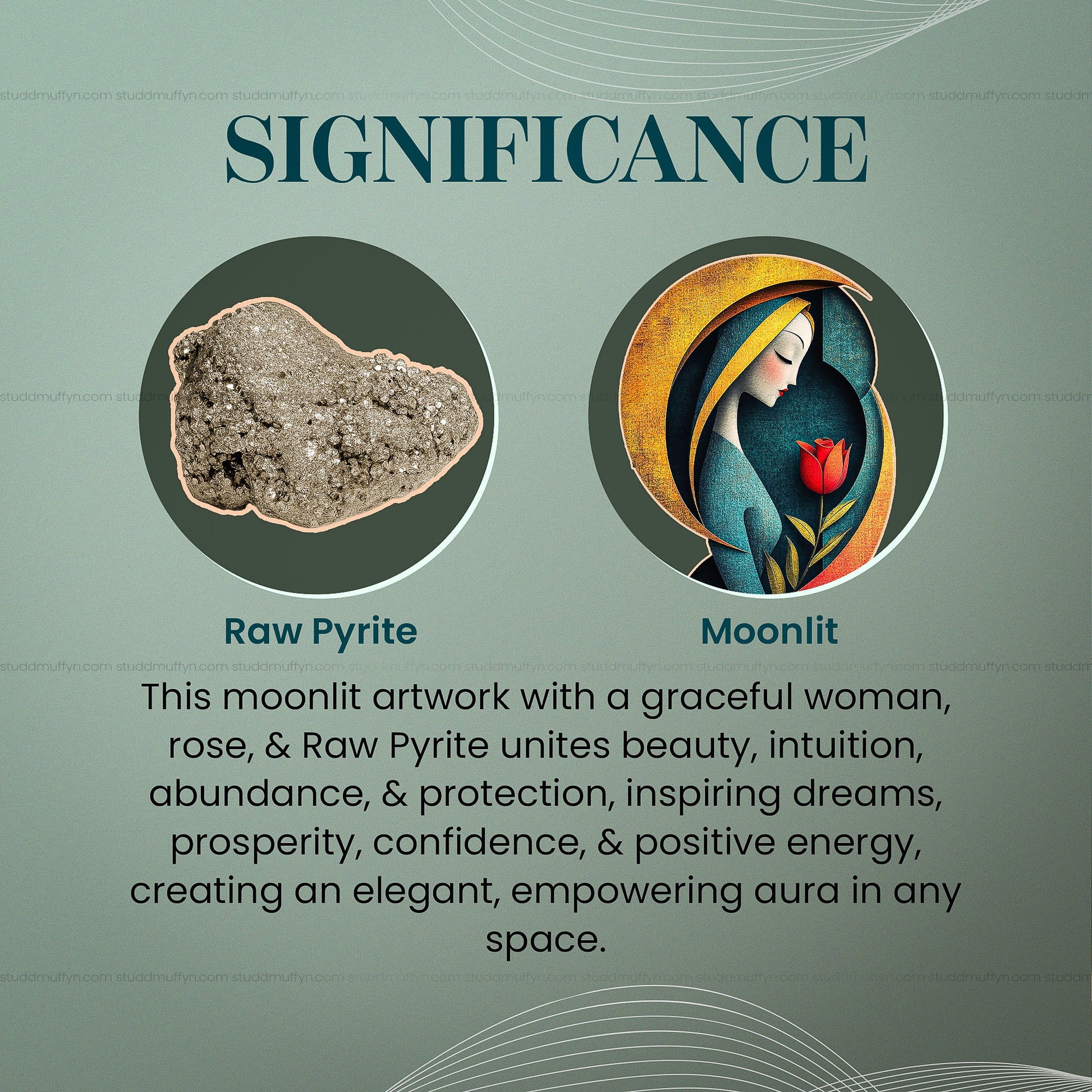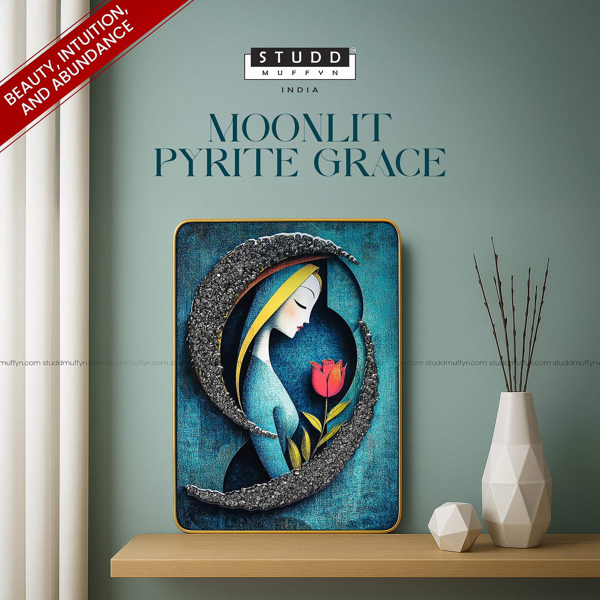 From the house of Studd Muffyn Crystal Homes, experience the ethereal beauty of art meeting the energy of nature. The Moonlit Grace frame blends serene artistry with the protective, prosperity-attracting powers of natural Pyrite crystals.