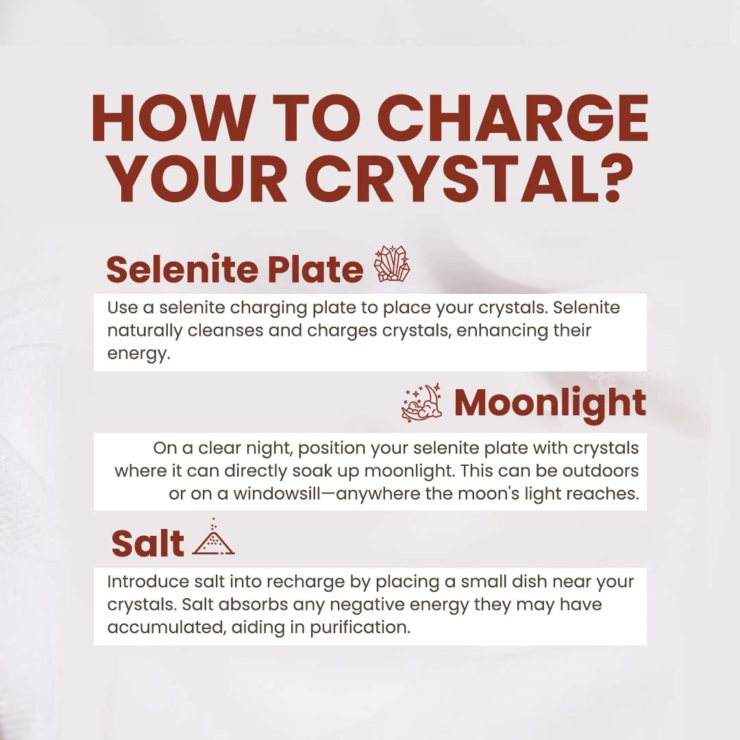 Recharge: The best way to do that is to keep them in a place that gets moonlight, overnight. You can also put the crystal in salt for at least 15-20 minutes on normal days. On full moon nights let it sit in salt overnight.
