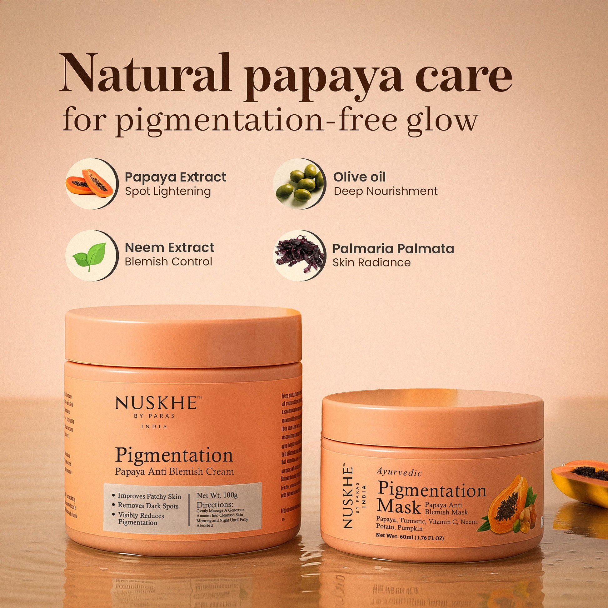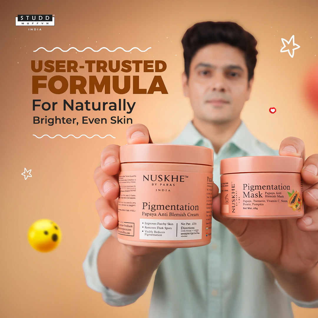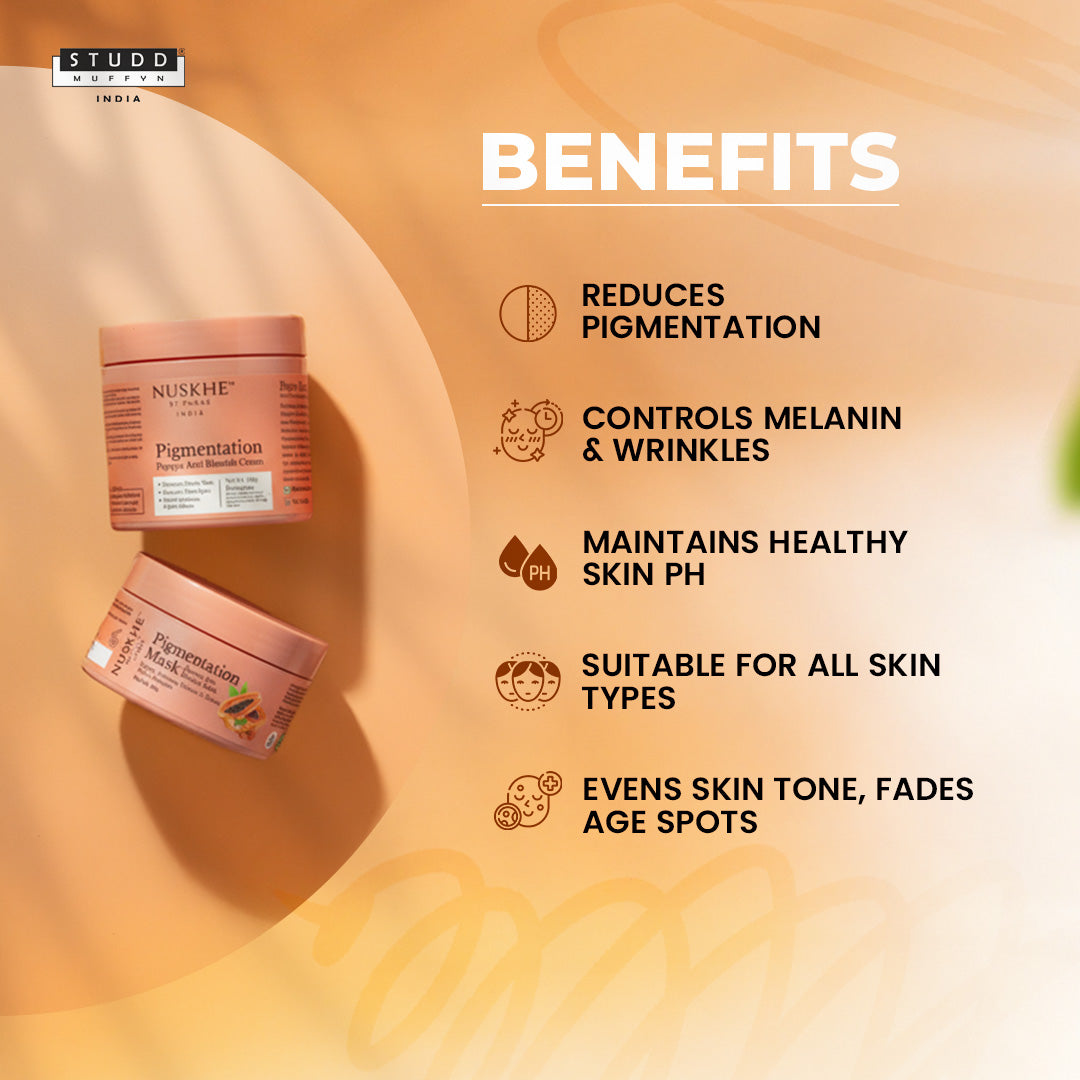 So Studd Muffyn got you, with our new pigmentation combo. The Goodness of papayas filled in two bottles, isn't it magic itself? A combo of Pigmentation Cream and Pigmentation Mask which will definitely make your skin love you more.