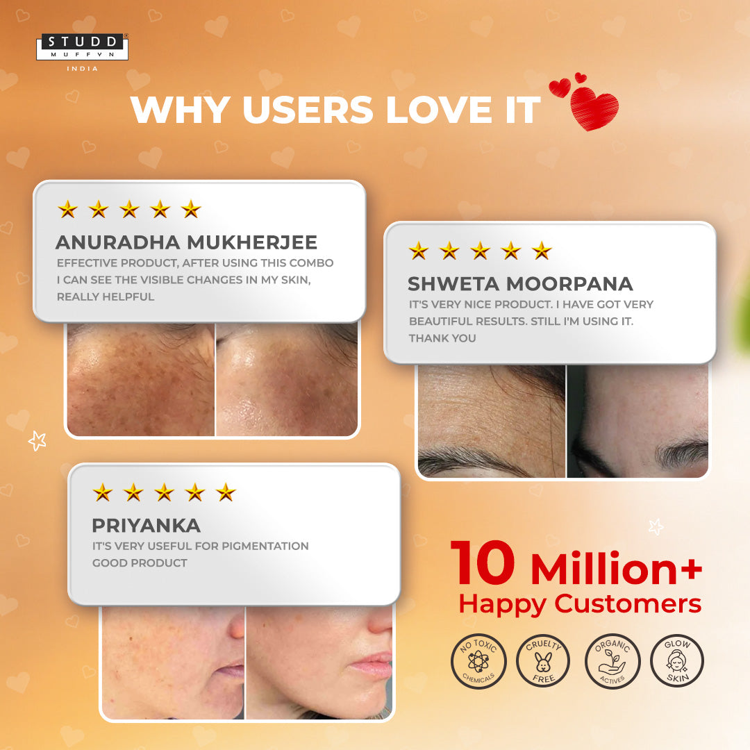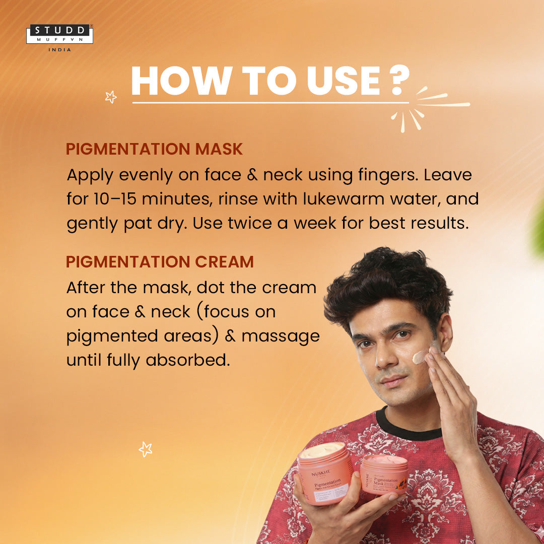 Trying to get rid of pigmentation with chemicals? Don't do this to your skin! Studd Muffyn got you, with our new pigmentation combo. A combo of Pigmentation Cream & Pigmentation Mask that will definitely make your skin love you more. This helps in reducing pigmentation, decreases melanin production, maintains ph balance & prevents wrinkle formation. The formula is ideal for all skin types.