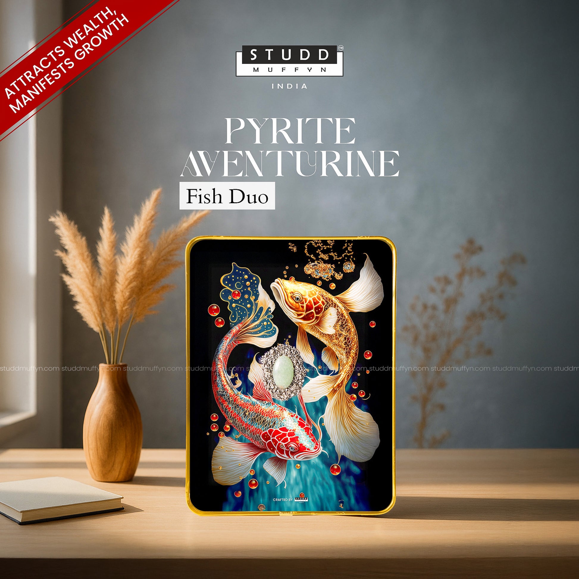 Celebrate harmony, abundance, and growth with the Pyrite Aventurine Fish Duo – a captivating creation that blends artistry with the powerful energies of Pyrite and Aventurine. The two koi fish represent balance, prosperity, and the continuous flow of success, while the shimmering pyrite attracts wealth and protection. Aventurine, known as the “Stone of Opportunity,” enhances growth, optimism, and good fortune.