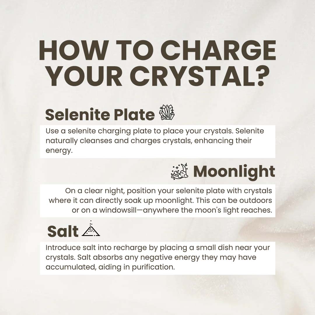 Recharge: The best way to do that is to keep them in a place that gets moonlight, overnight. You can also put the crystal in salt for at least 15-20 minutes on normal days. On full moon nights let it sit in salt overnight.