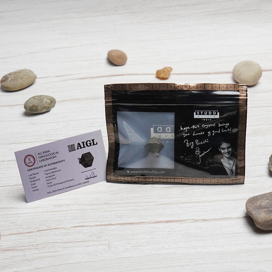 This crystal is for money and abundance. Pyrite attracts money, it’s known to be a money magnet. According to Crystal healing, having this crystal with you attracts wealth and fame. The 3d hexagonal pendant is a money magnet and it's super stylish. For men & women. These naturally occurring crystals have been shaped to make this hexagonal pendant keeping their natural cuts, and fissures in place. We haven’t excessively polished them so you may have pieces that have natural fissures in them.