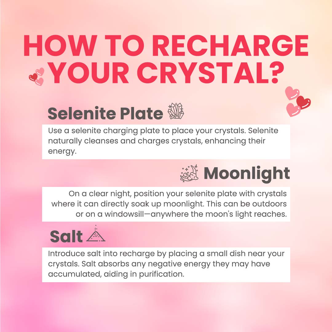 Recharge: The best way to do that is to keep them in a place that gets moonlight, overnight. You can also put the crystal in salt for at least 15-20 minutes on normal days. On full moon nights let it sit in salt overnight.