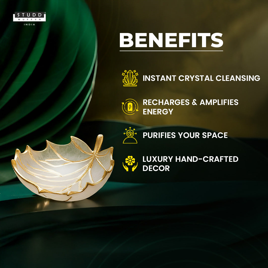 Hand-crafted in the shape of a delicate leaf with elegant gold vein detailing, this Selenite Recharging Bowl is a powerful metaphysical tool designed to cleanse, recharge, and amplify the energy of your crystals, jewellery, and sacred objects.