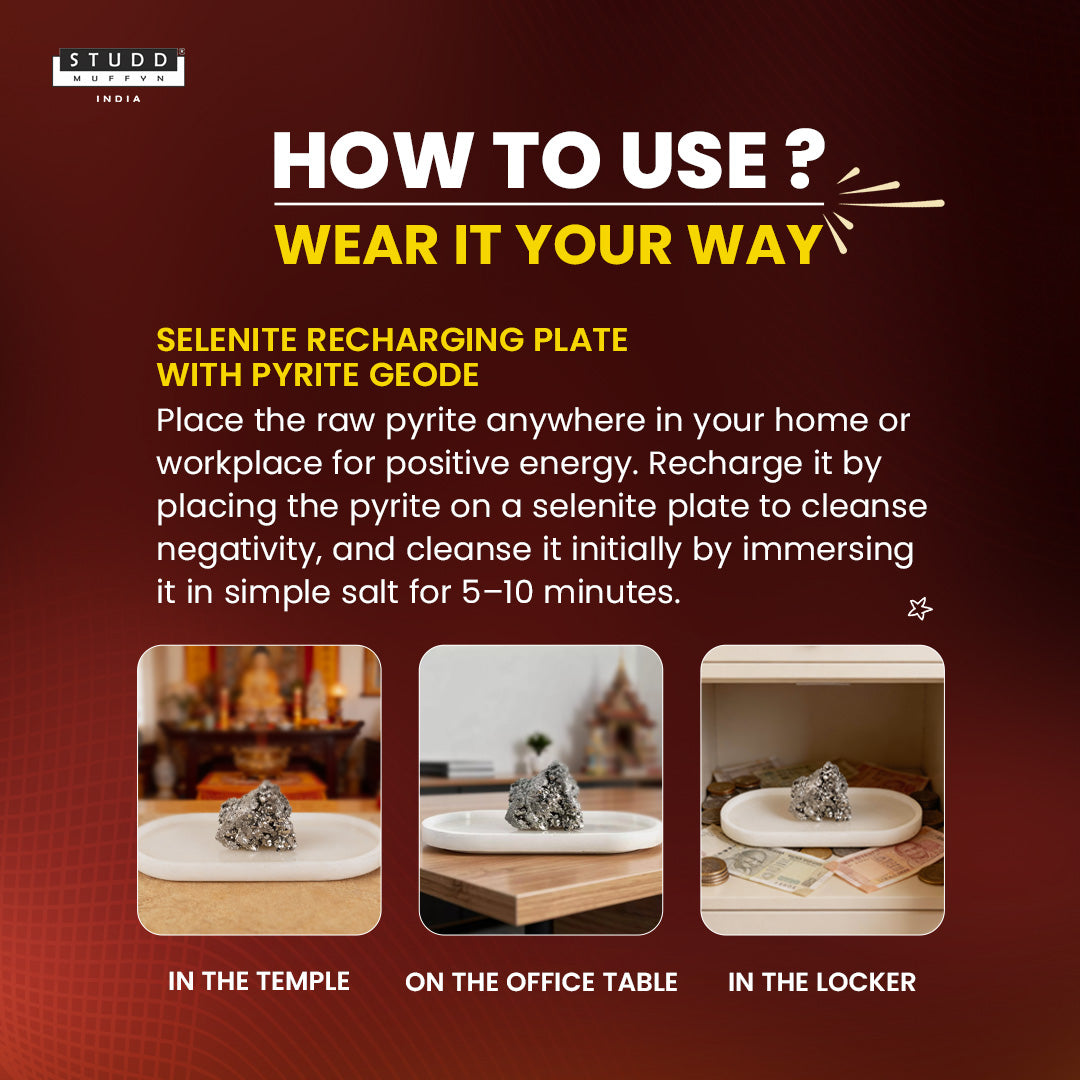 ✡Recharge: Place the pyrite geode on the Selenite plate to recharge and clean away any negative energy.