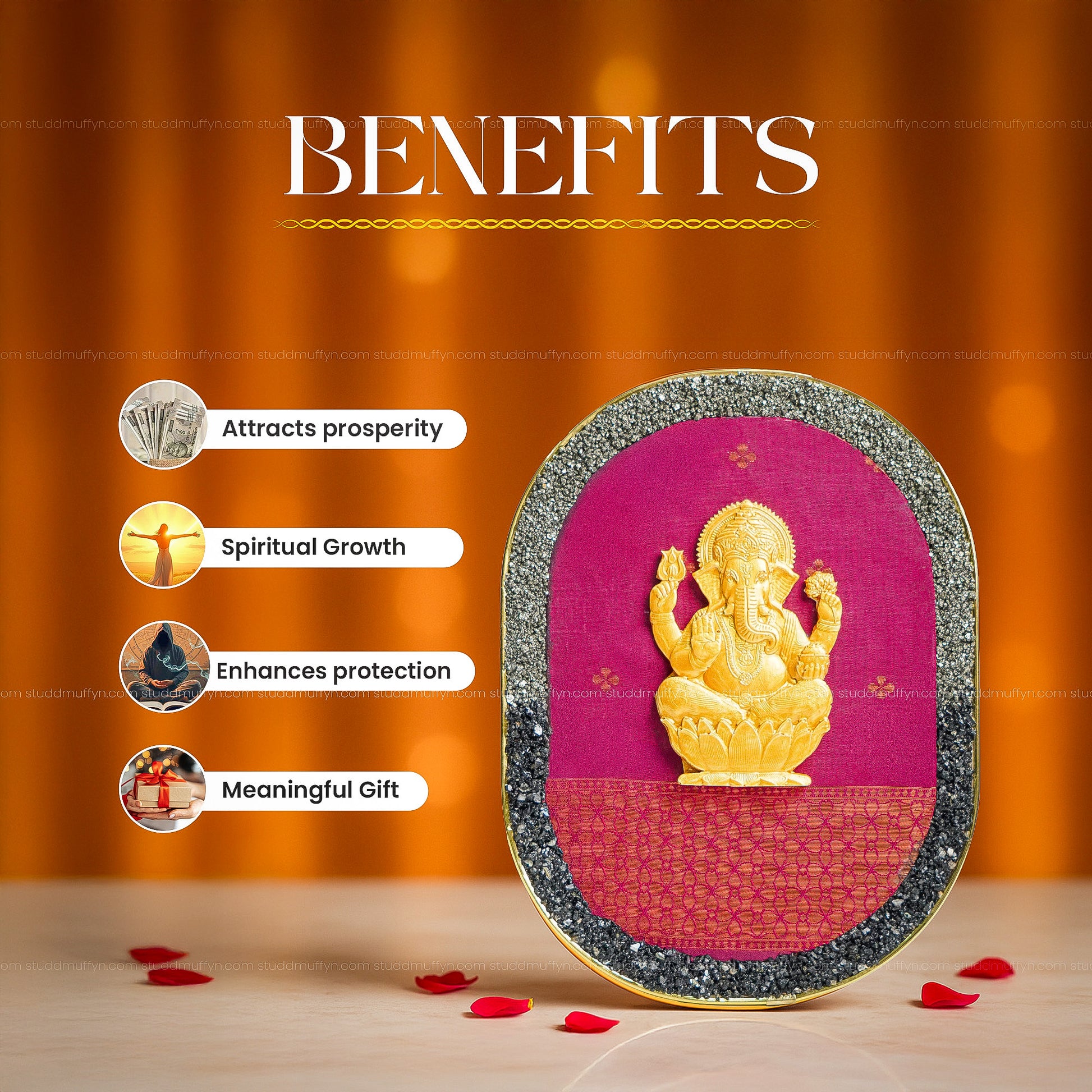 Invite prosperity, wisdom, and divine energy into your home with Lord Ganesha Silk-RicheRich Frame. Handcrafted with meticulous detail, this exquisite artpiece features a 3D golden Ganesha idol seated gracefully against a backdrop of royal silk fabric, bordered with authentic Pyrite and Tourmaline crystals.