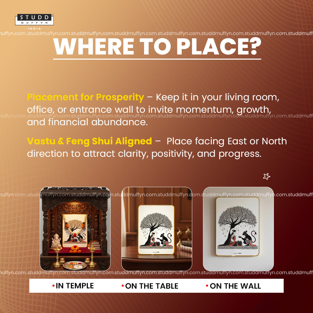 The artwork is elevated with authentic Pyrite crystal chips, carefully embedded to channel prosperity, protection, and positive energy into your home. Finished with a luxurious golden border and premium gloss surface, this masterpiece arrives with a sturdy display stand and a Certificate of Authenticity, making it a timeless symbol of faith and abundance.