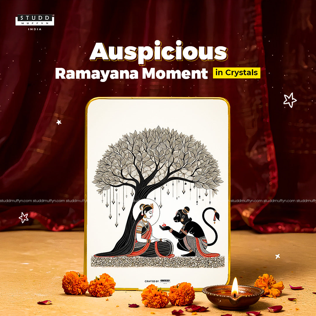 A beautiful keepsake to attract strength & blessings into your home. Inside this sacred art plate lies a beautifully hand-illustrated moment from the Ramayana — Maa Sita and Lord Hanuman beneath the divine Ashok tree — intricately detailed to capture every emotion of devotion and hope.