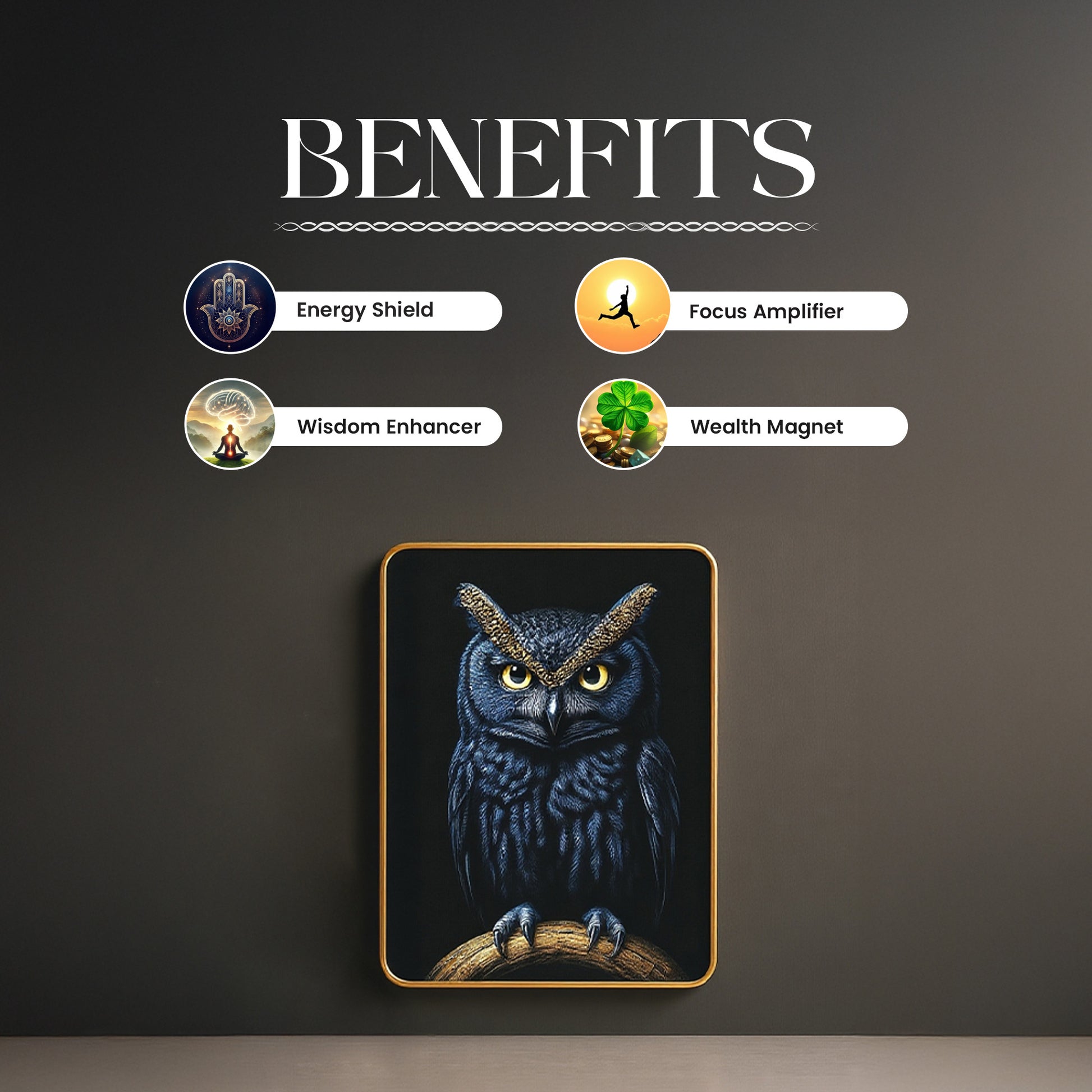Infused with a strip of authentic Pyrite crystal, often known as “Fool’s Gold,” this artwork transcends visual beauty. Pyrite is revered as a powerful stone for attracting abundance, shielding from negativity, and igniting mental clarity — making this owl not only a visual guardian but an energetic anchor for focus and prosperity.