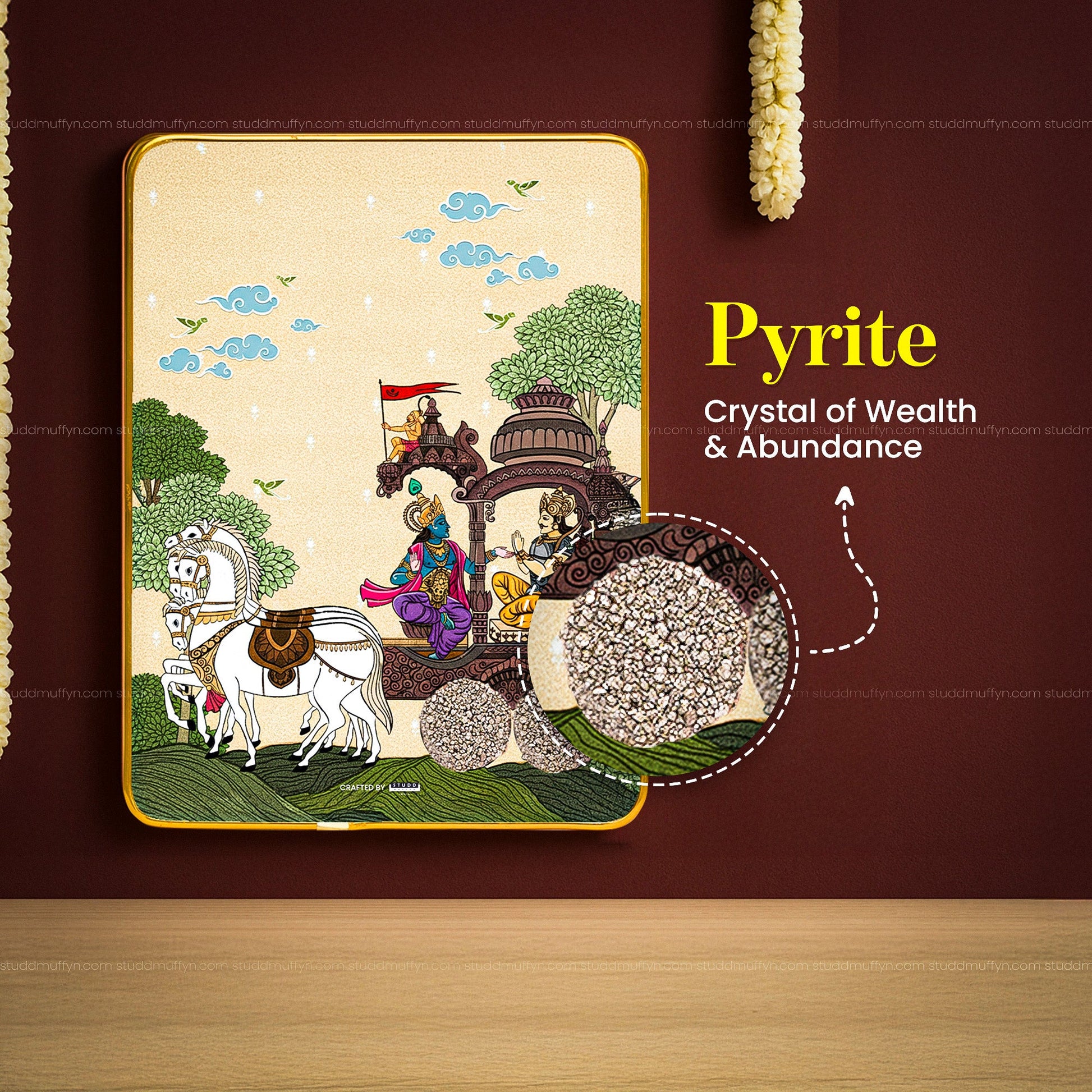 A sacred blend of art and energy — this handcrafted frame captures the divine chariot scene of Lord Krishna and Arjuna, symbolizing guidance, purpose, and victory. Embedded with natural pyrite geodes, it radiates protection, prosperity, and confidence.