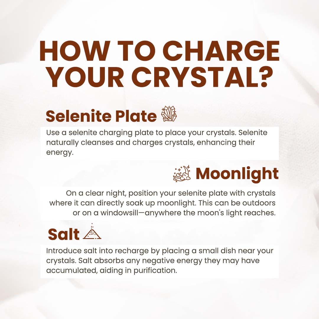 Recharge: The best way to do that is to keep them in a place that gets moonlight, overnight. You can also put the crystal in salt for at least 15-20 minutes on normal nights. On full moon nights let it sit in salt overnight.