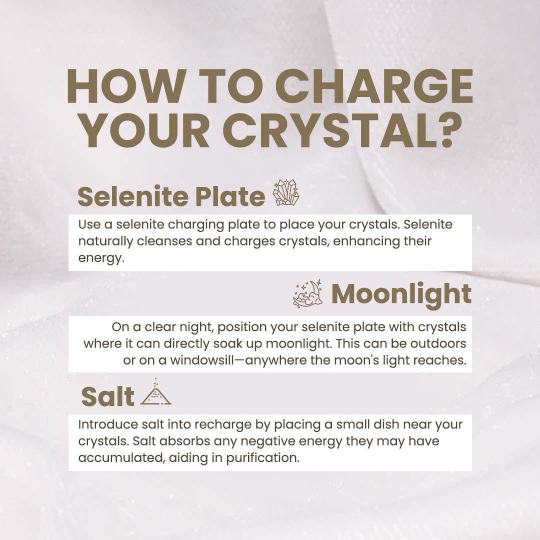 Recharge: The best way to do that is to keep them in a place that gets moonlight, overnight. You can also put the crystal in salt for at least 15-20 minutes on normal days. On full moon nights let it sit in salt overnight.