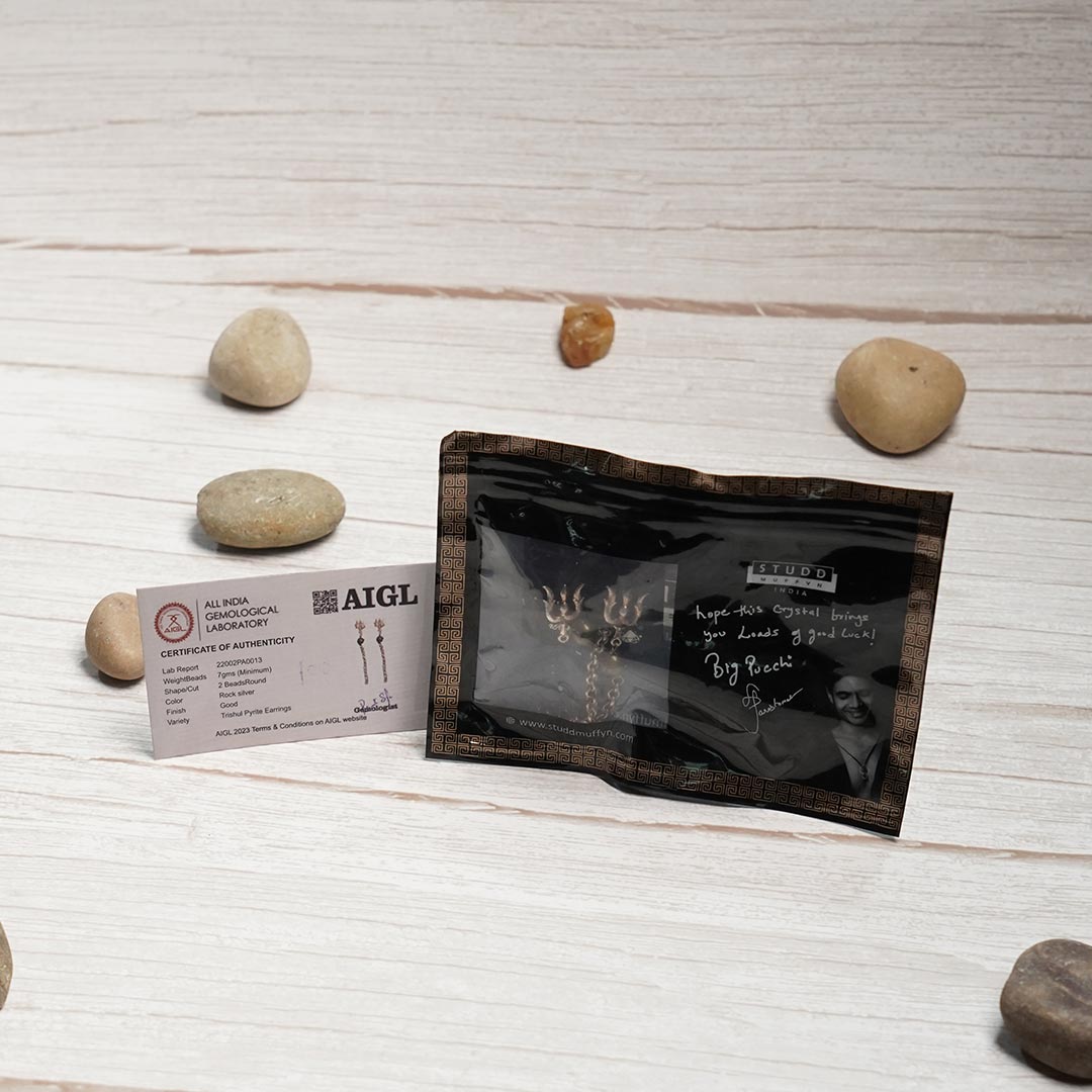 Pyrite Trishul Earrings are for wealth and abundance. The Pyrite stud is a money magnet and it's super stylist for both men and women. These naturally occurring crystals have been shaped to make this hexagonal pendant keeping their natural cuts , fissures in place. They are not polished and in there raw form. Pyrite Trishul Earrings are created with hand-chosen Pyrites beads and crafted beautifully with stainless steel. A perfect form of Pyrite which can be worn anywhere it doesn't matter if it's an office, wedding, or birthday.
