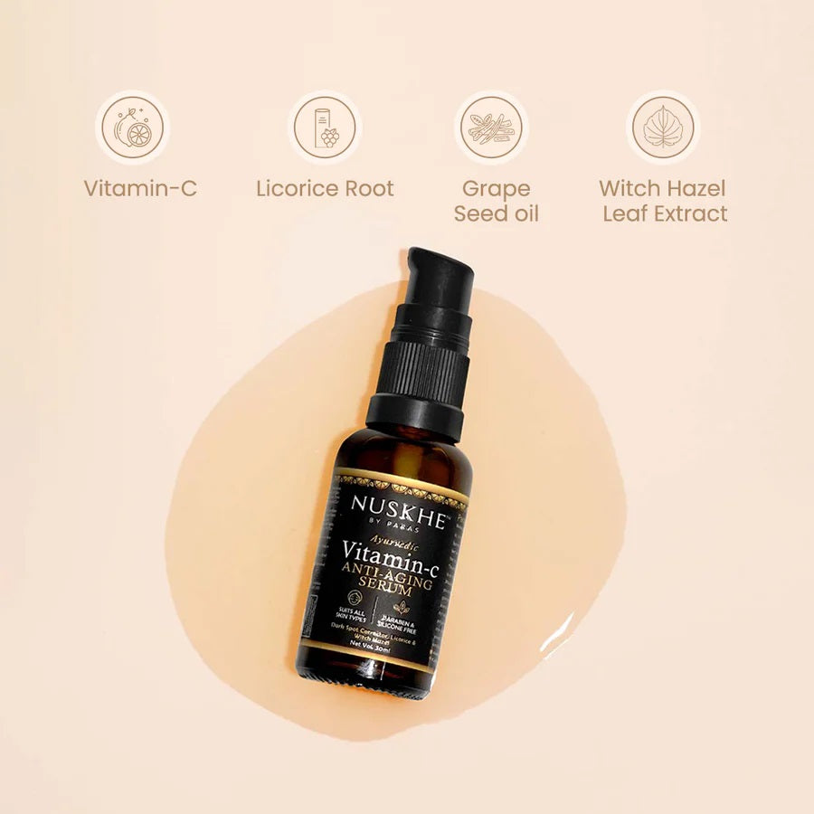 Our Vitamin C Skin Serum Covers open Pores, Wrinkles, Blemishes, and Pigmentation, Gives Glow and Shine to Face Skin, Especially Dark & Dull Skin, Gives Smooth, Fine & Classic Long Lasting Makeup -prevents Skin From Harmful Effects of Makeup-Chemicals, Contains SPF-20, Which Prevents Our Skin From Harmful UV Rays, Flawless, ageless skin, This Nuskhe By Paras Ayurvedic Anti Aging Serum is our favorite and most powerful age-defying solution yet. Use this elixir once before bed at night to preserve youthful skin and wake up with a radiant glow"